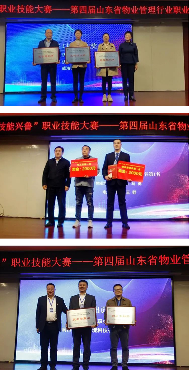 山东兰宝威物业服务有限公司马勇、山东威高物业服务有限公司吴洁、威海卓跃物业服务有限公司徐雪飞获物业管理员总成绩前三名。济宁代表队、济南代表队、威海代表队获团体奖——最佳组织奖前三名。