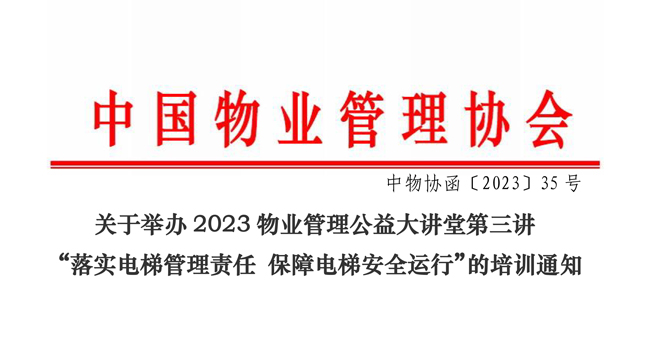 为认真落实习近平总书记关于“把生产安全责任制落到实处,切实防范重特大安全生产事故的发生”重要指示要求,进一步宣贯2023年5月5日起实施的《特种设备使用单位落实使用安全主体责任监督管理规定》(国家市场监督管理总局第74号令),中国物协定于5月31日,通过网络现场直播2023年“暖心服务 携手同行”物业管理公益大讲堂第三讲,主题聚焦“落实电梯管理责任 保障电梯安全运行”。现将有关事项通知如下: