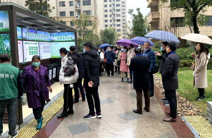 通过一个月时间的宣贯和筹备,2019年11月22日,毓秀天城小区垃圾桶撤除并点,生活垃圾正式开始实行分类投放。当天,园区现场还开展了“物以类聚,家园共建”主题的宣传活动,市相关主管部门也莅临现场指导,居民踊跃互动参与,现场气氛浓烈。