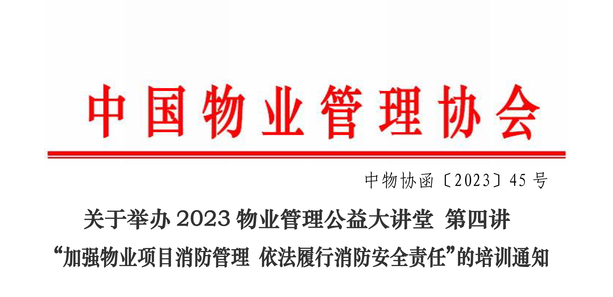 2023年6月是第22个全国“安全生产月”,主题为“人人讲安全、个个会应急”,为贯彻落实国务院安委会有关要求,全面加强消防安全防范工作,中国物协定于6月28日,通过网络直播举办2023年“暖心服务 携手同行”物业管理公益大讲堂第四讲,主题聚焦“加强物业项目消防管理 依法履行消防安全责任”。现将有关事项通知如下: