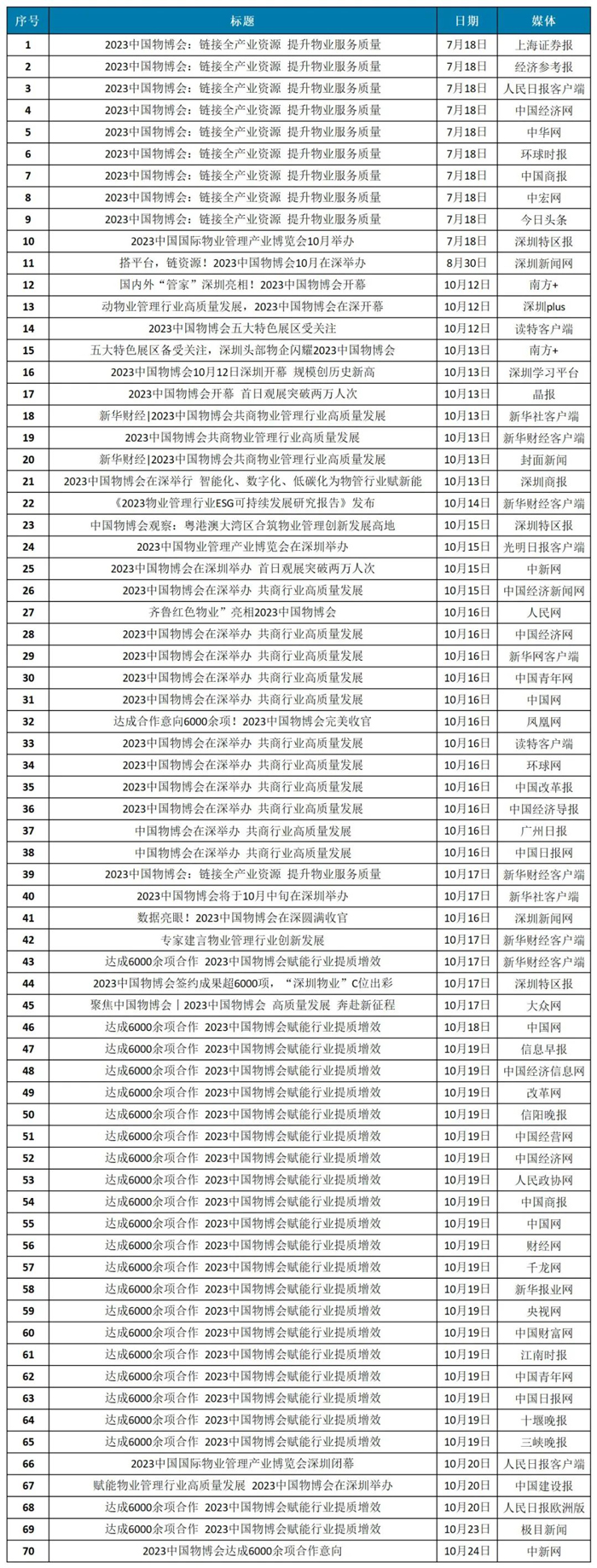 新华财经、深圳新闻网、大众网、网易、新浪、腾讯、搜狐等众多媒体对主论坛、分论坛、嘉宾观点及各类研究报告成果均进行了大量报道和解读。舆论普遍认为,系列论坛堪称行业思想盛宴,专家建言献策以及相关研究成果为本届中国物博会增添了“硬核”影响力。《2023物业管理行业ESG可持续发展研究报告》《物业管理经典案例(100篇)》《“大物业”探索与实践白皮书》等研究成果为物业管理行业带来了更多新理念、新经验和新知识。