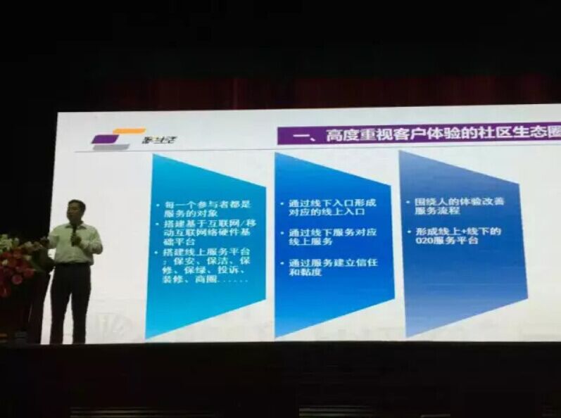 下午,彩生活服务集团总裁唐学斌首先向会议代表介绍了彩生活轻资产运营与上市的基本情况,提出社区服务轻资产模式代表了时代发展方向的观点,并从高度重视客户体验的社区生态圈、智慧社区O2O服务运营模式、创新+分享的社区服务平台和打造智慧社区O2O生态圈四方面,进行了详尽阐述。最后,对彩生活上市之路的感悟与致力于做中国最大的社区服务运营商进行了分享。