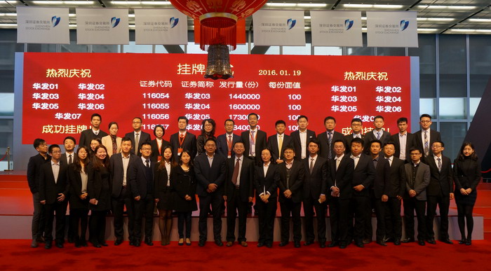 2016年1月19日,“华发物业资产支持专项计划”在深圳证券交易所成功挂牌。华发集团资金管理总监许继莉、华发物业公司董事长周文彬、华金证券公司董事长宋卫东和项目团队、华发物业公司常务副总经理曾师、华发物业公司财务总监钱芬、华发物业公司业务拓展部经理向罗成出席了挂牌仪式。