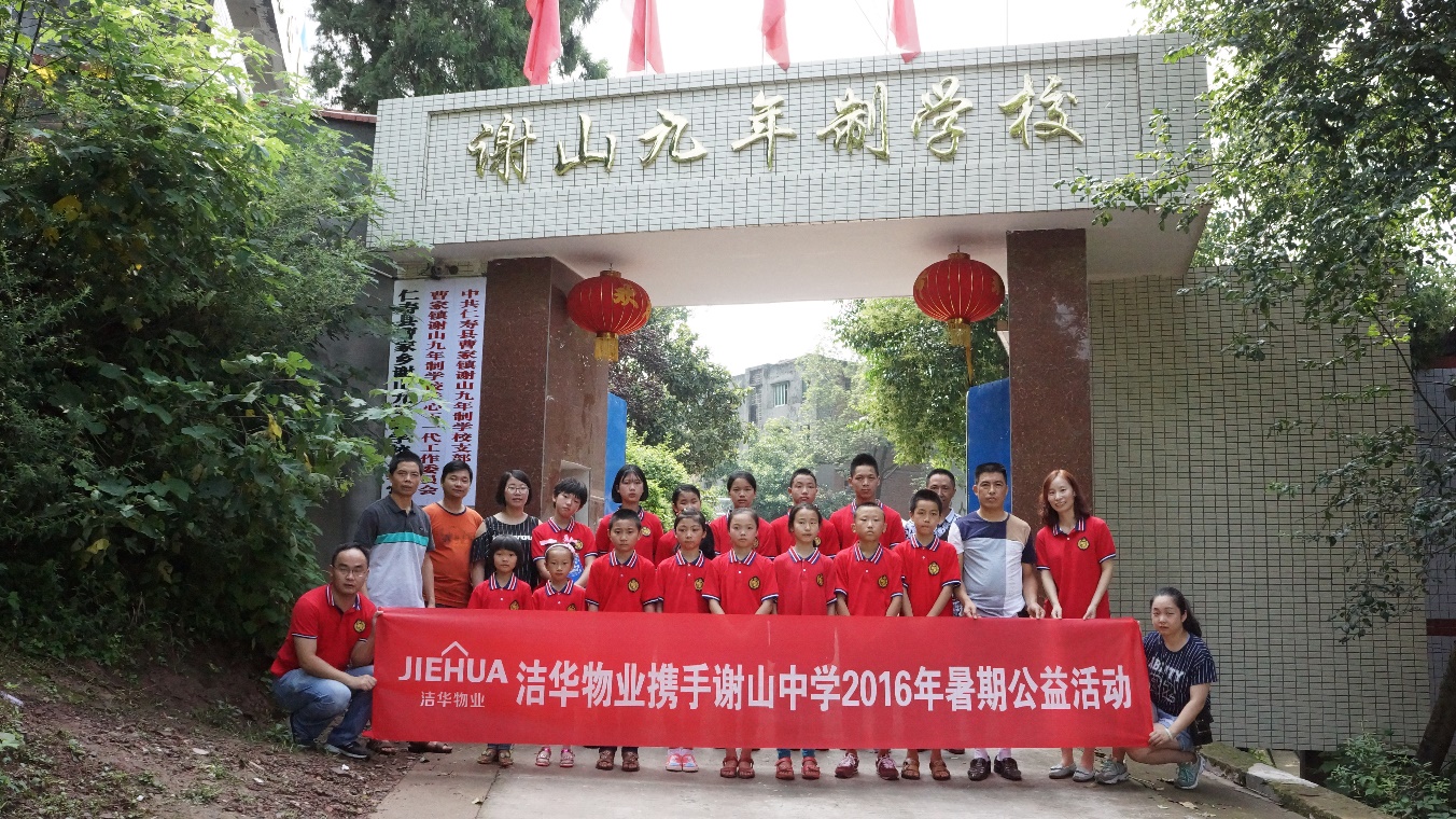 四川省仁寿县曹家乡谢山初级中学坐落在仁寿、井研、青神三县交界处的偏远山区,学校硬件设施极度落后。自2014年起,洁华物业开展对该校的爱心帮扶,先后为学校捐助环绕音响、增设班级书柜,资助贫困学生,暑期夏令营活动,邀请成绩优异的孩子们来到成都,参观游玩、增长知识。