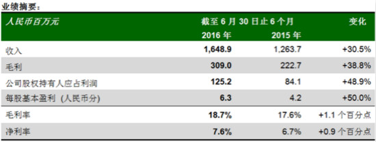 凭借良好的品牌口碑和优质服务,本集团在期内业绩表现亮丽,收入及利润均取得大幅增长。截至二零一六年六月三十日止六个月,绿城服务收入上升至人民币16.489亿元,同比增长30.5%。其中,物业管理服务收入达约人民币11.778亿元、顾问咨询服务收入达约人民币3.131亿元、园区增值服务收入约为人民币1.58亿元,三大业务收入同比均取得双位数增长。毛利为人民币3.09亿元,同比增长38.8%;得益于有效的成本控制及销售成本增幅低于收入增幅,期内集团毛利率同比去年增长1.1个百分点至18.7%。本公司股权持有人应占利润约为人民币1.252亿元,同比增加48.9%。每股基本盈利为人民币0.063元。董事会一致决议不宣派截至二零一六年六月三十日止六个月的中期股息。