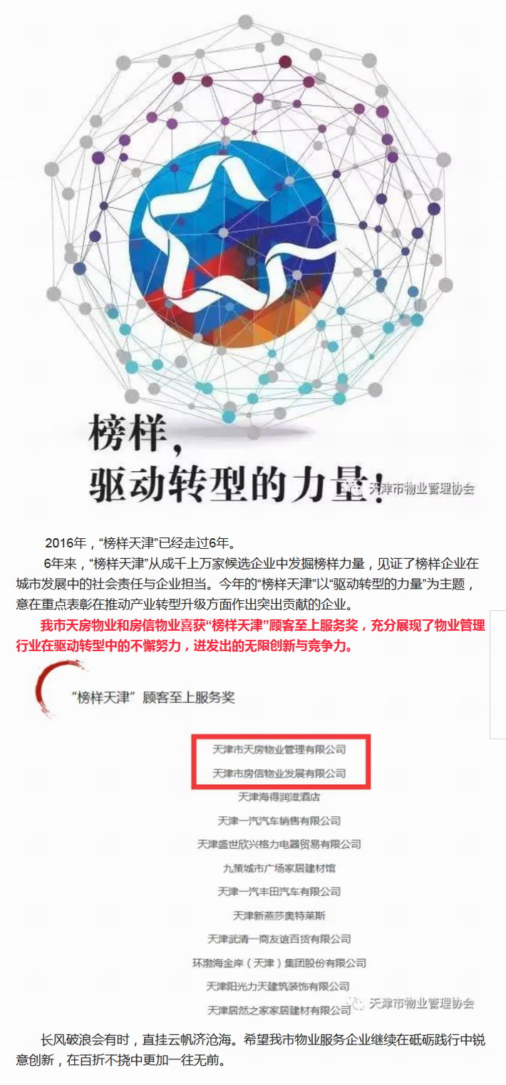 天津市天房物业和房信物业喜获“榜样天津”顾客至上服务奖
