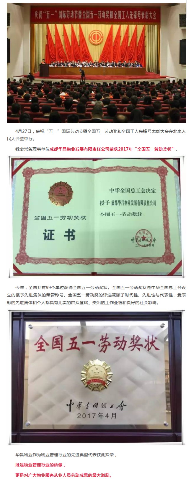 成都华昌物业发展有限责任公司荣获2017年“全国五一劳动奖状”