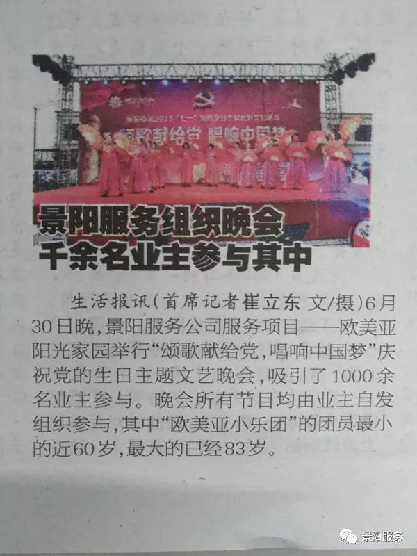 6月30日,为庆祝党的96岁生日,景阳服务在欧美亚阳光家园举办“颂歌献给党,唱响中国梦”主题文艺晚会,现场彻夜灯火通明,吸引了1000余名业主参与。晚会所有节目均由业主自发组织参与,其中“欧美亚小乐团”的团员最大的已经83岁,最小的也近60岁。据了解,景阳服务于今年4月1日接管欧美亚阳光家园项目,这一次也是该项目入住10年来的第一次文艺晚会。