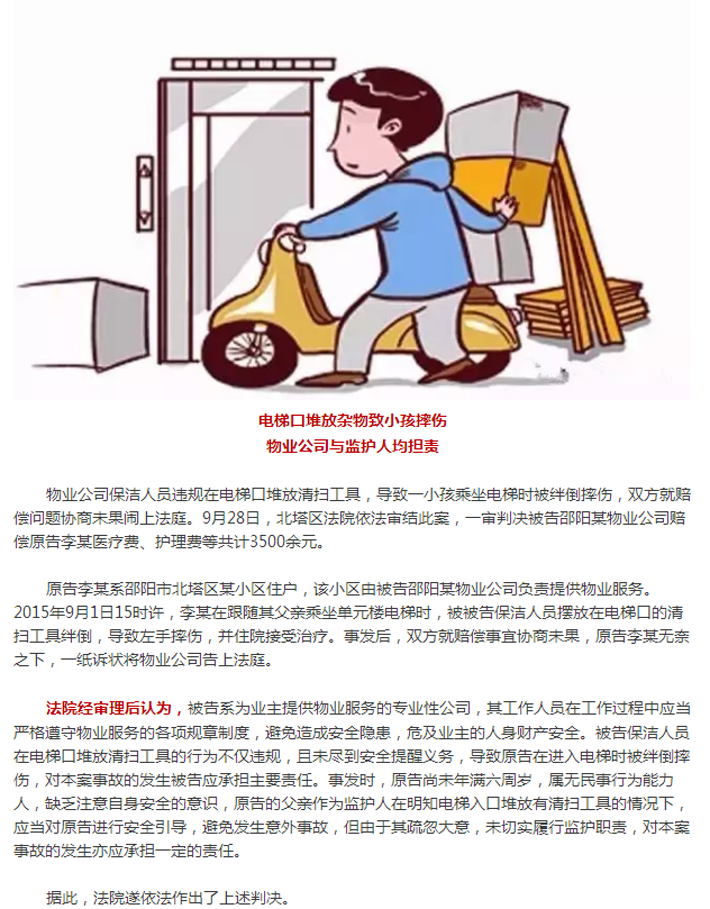 电梯口堆放杂物致小孩摔伤,物业公司与监护人均担责