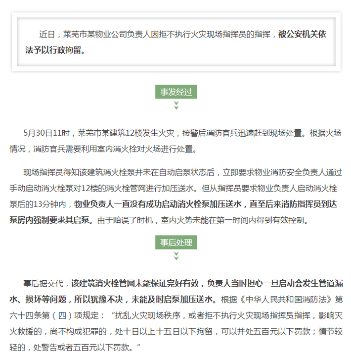 一物业负责人拒绝加压送水,耽误灭火被拘