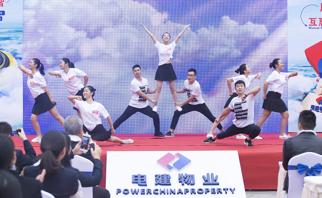 之后,激情的开场舞蹈火爆上演,激昂的旋律、有力的节拍,催人奋进,开场舞蹈后在五兴仪仗队的引领下,各支参赛队伍迈着有序的步伐,精彩亮相;来自营地项目的员工表演了歌舞,并向嘉宾们献上了哈达,展示了藏族特色;来自西岸观邸的业主们表演了舞蹈《载歌载舞》,多才多艺的业主们热心参与,为技能大比武增添了色彩;五兴员工自编自演的舞蹈《我相信》结合了物业工作的优美舞姿,让人眼前一亮;仪仗队队员们的《擒敌拳》更是展现了五兴秩序员的风采。