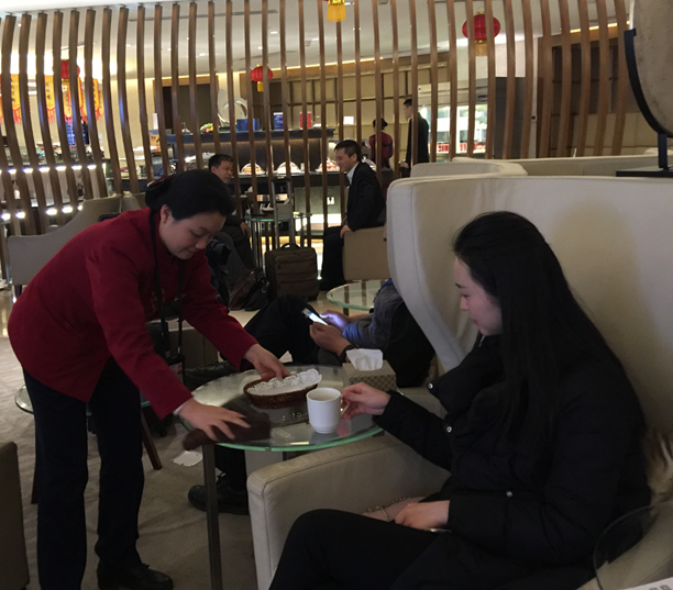 这里是中电建五兴物业公司服务的国航成都双流国际机场VIP会员区、T1航站楼国际区,当您在这里焦急等待您回家的班机的时候,窗外是乍暖还寒的风和起起落落的飞机,候机室里是干净舒适的座位和浓浓的节日氛围。也许,您为了旅途更轻松,你想在这里小憩;或许,您只是想在这里收拾一下回家的心情,他们,脚步轻轻,只如清风拂过,不会给您带来一丝的打扰。