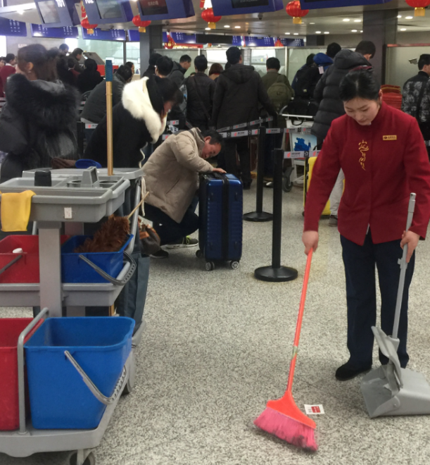 人流量超大的春运,干净整洁的环境需要花更多的时间和精力来维护,清理地毯、整理桌面、擦拭座位、标识标牌、清运垃圾……因为有他们奔波在这些繁琐的工作中,才有您的舒适相随。