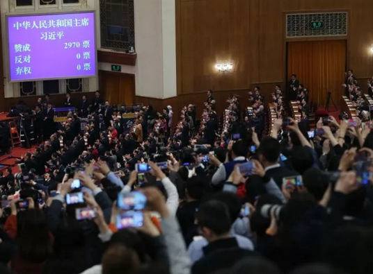 计票结果显示,在国家主席、中央军委主席选举中,习近平均获得全部2970张赞成票,全场报以热烈掌声。