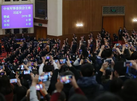 当主持人宣布习近平同志当选为中华人民共和国中央军事委员会主席时,会场上再次响起热烈的掌声,习近平又一次起身向代表们鞠躬致意。