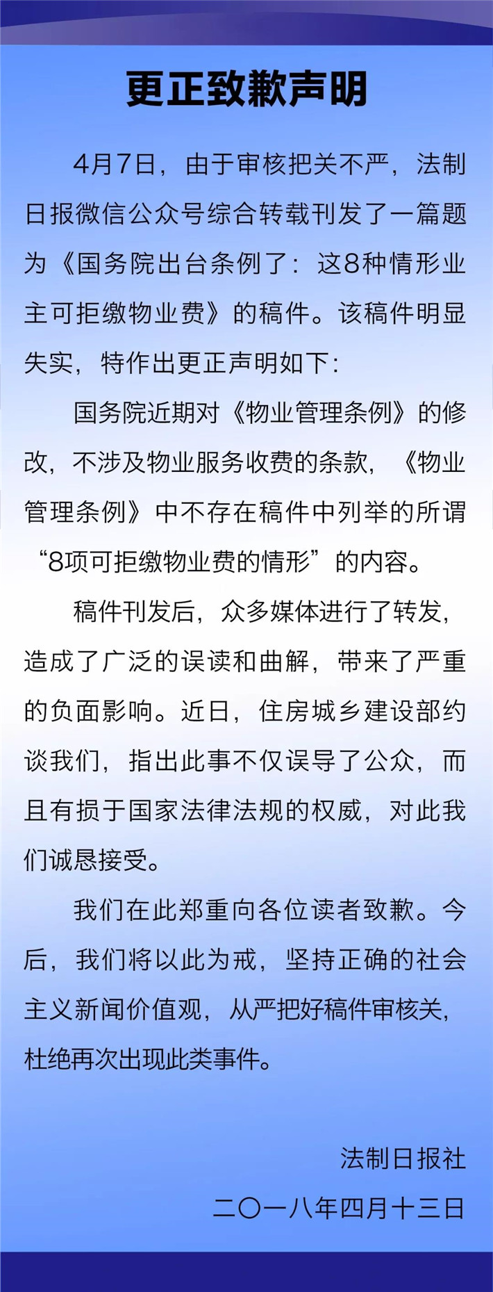 法制日报关于“这8种情形业主可拒缴物业费”稿件的更正致歉声明