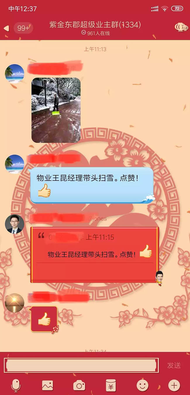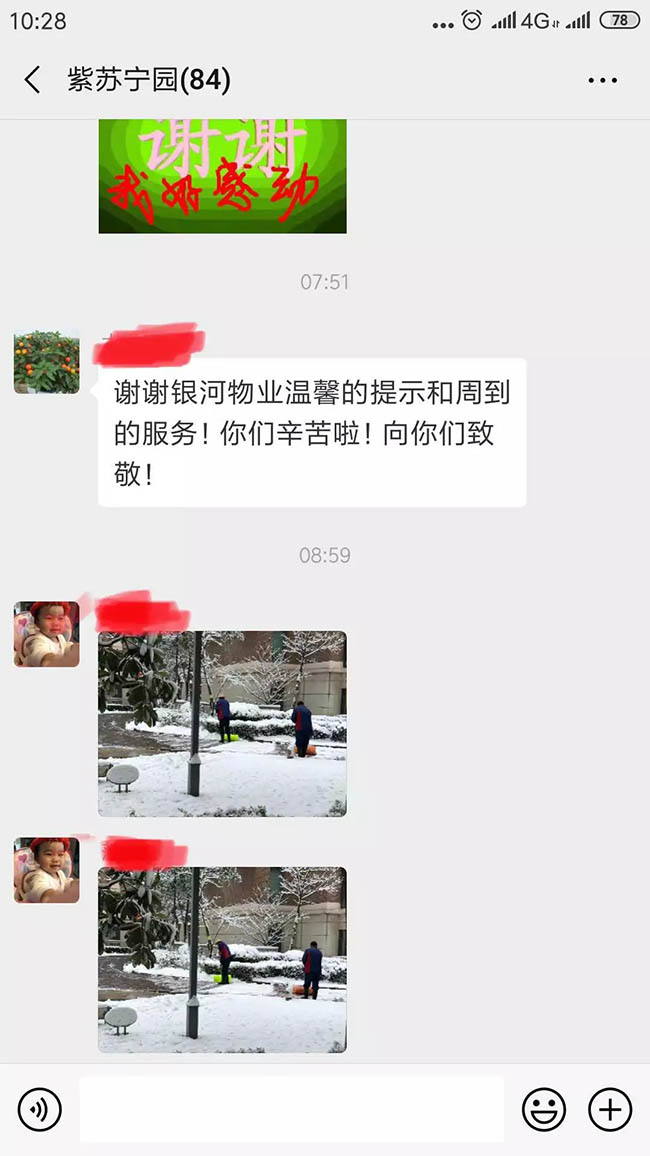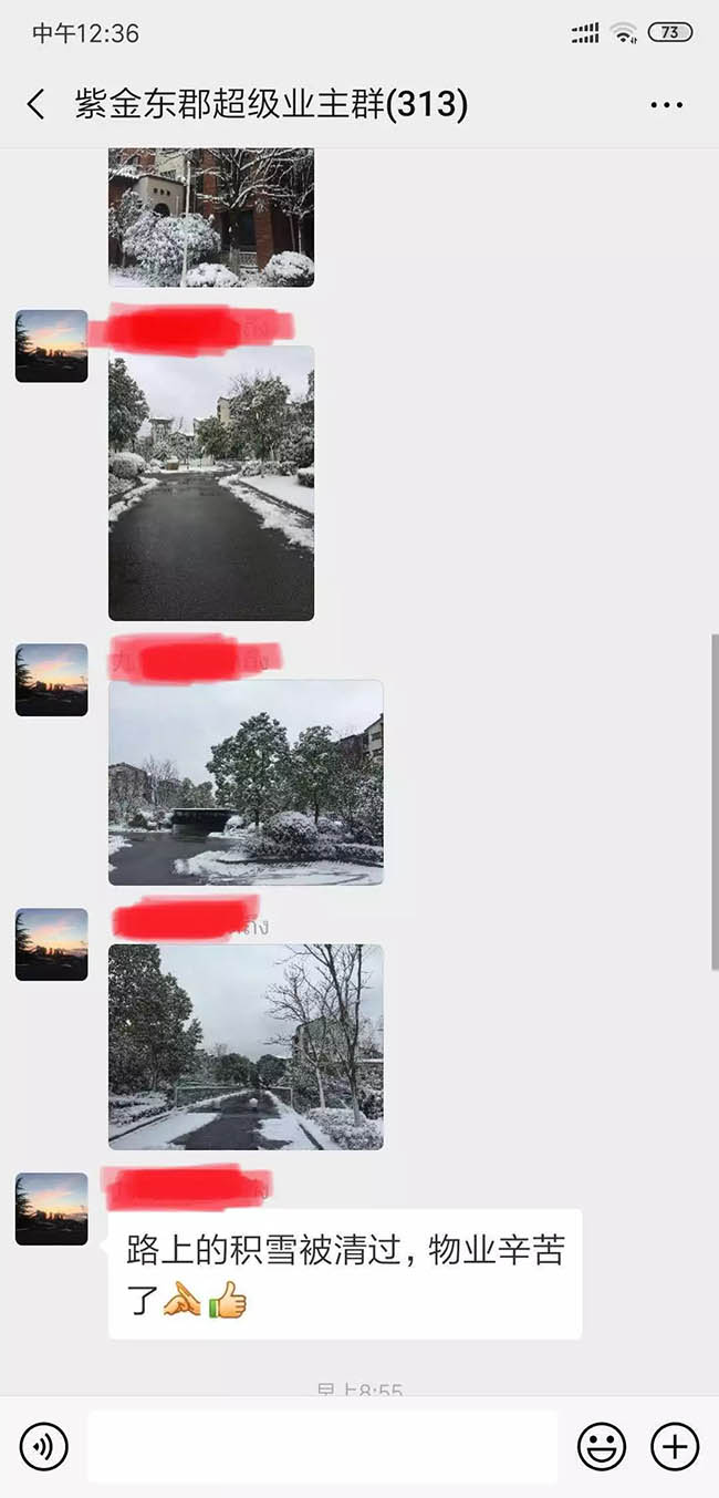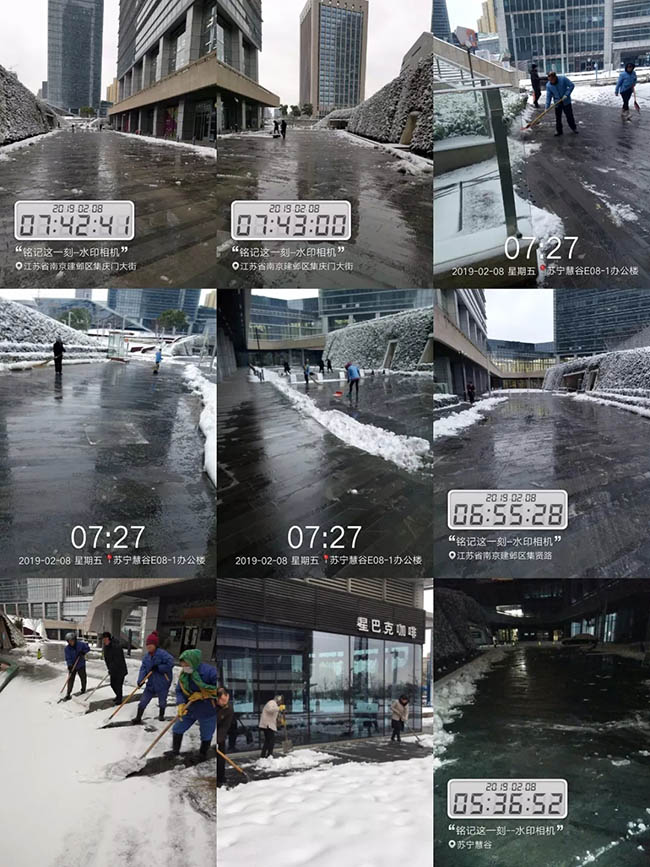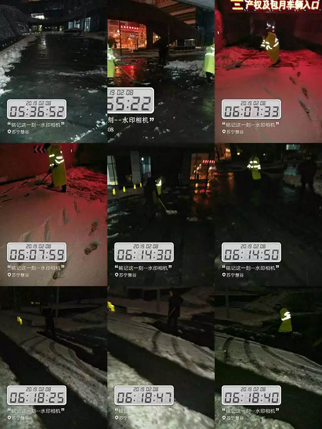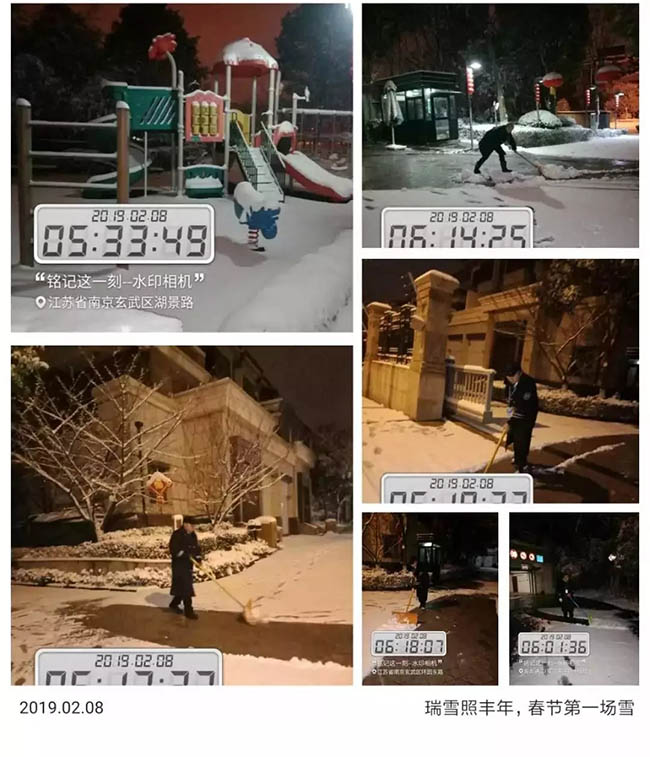 深夜,大雪如约而至,洋洋洒洒间瞬间白了金陵城大街小巷。当大家伴着美景入梦的同时,苏宁银河物业人各项目为营,化身城市守护者,分布在项目岗亭出入口、园区干道、业主单元门口、车库等“雪战”重地,重复清扫,力战至清晨惊艳到业主的一条条暖心的出行路和无数业主点赞。