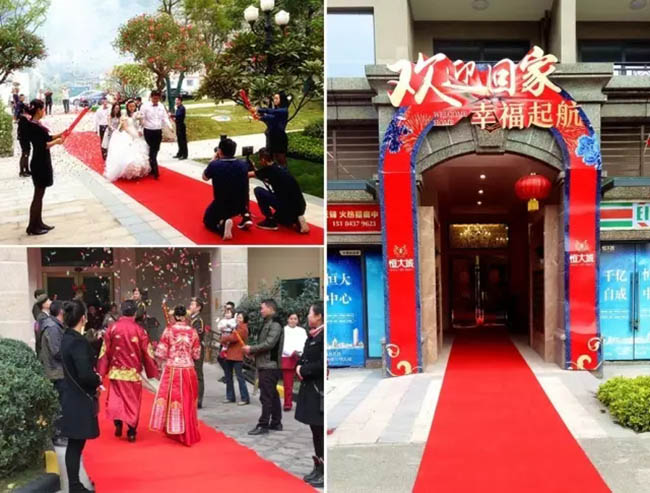 铺红毯、贴喜字、迎礼车,物业人员精心安排。保安员组成的婚礼仪仗队,用标准的军姿迎接婚车的到来。拍下一幅幅照片记录新人的喜庆时刻。