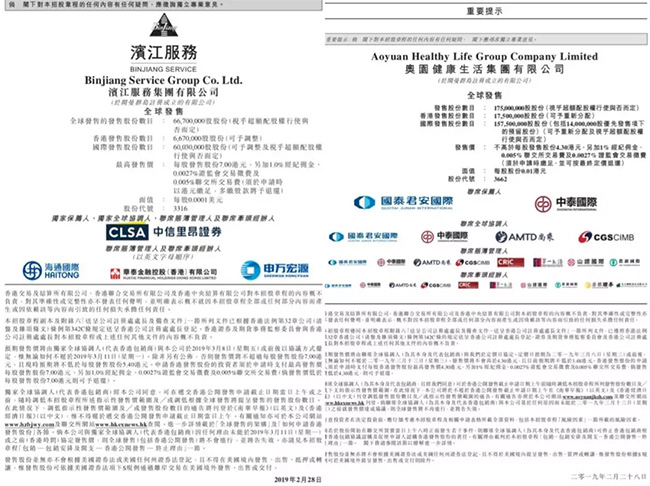 1、2月28日,滨江服务集团有限公司、奥园健康生活集团有限公司两家物业公司同时发布招股公告。此次滨江服务将在全球发售6670万股,每股发行价5.40-7.00港元,而奥园健康生活将全球发售1亿7500万股,其中每股发行价3.48-4.30港元,预计股份分别于3月15日、3月18日开始在香港联交所买卖。