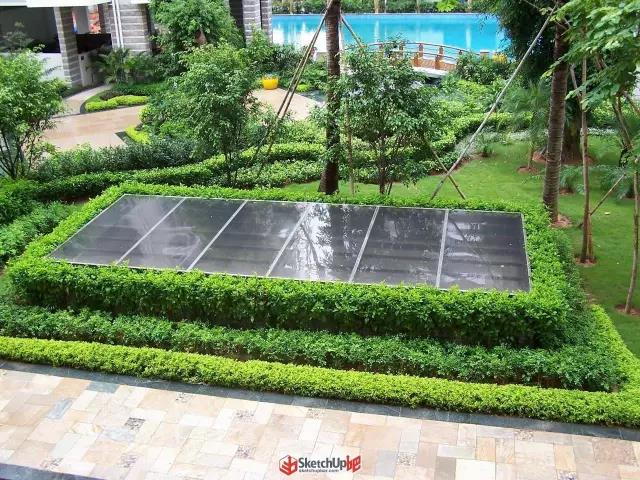 配置要点:采光井、通风井一般在绿化中的出现都比较突兀,通常做法是用几个层次植物将其掩映遮挡