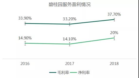 2018年碧桂园服务整体毛利率达到了37.7%,而净利润率约为20%相比2017年来说都获得了巨大的增速。