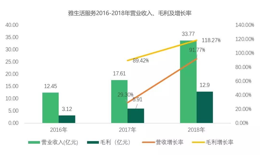 2018年雅生活服务业绩取得大幅度增长,其实现营业收入33.8亿元,同比增长91.8%;毛利达到12.9亿元,同比增长118.4%远高于20175.9%89.4%的营收及毛利增长率。