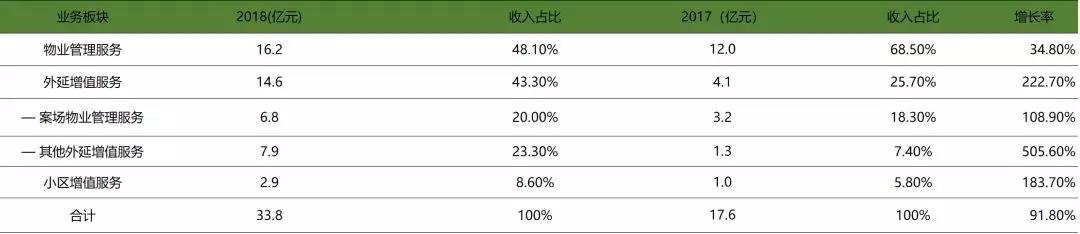 其中,物业管理服务为集团的主要收入来源,2018年收入达人民币16.2亿元,较2017年同期增加34.8%;外延增值服务收入达人民币14.63亿元,较2017增长222.7% ;小区增值服务收入达人民币2.89亿元,较2017年增长183.7%