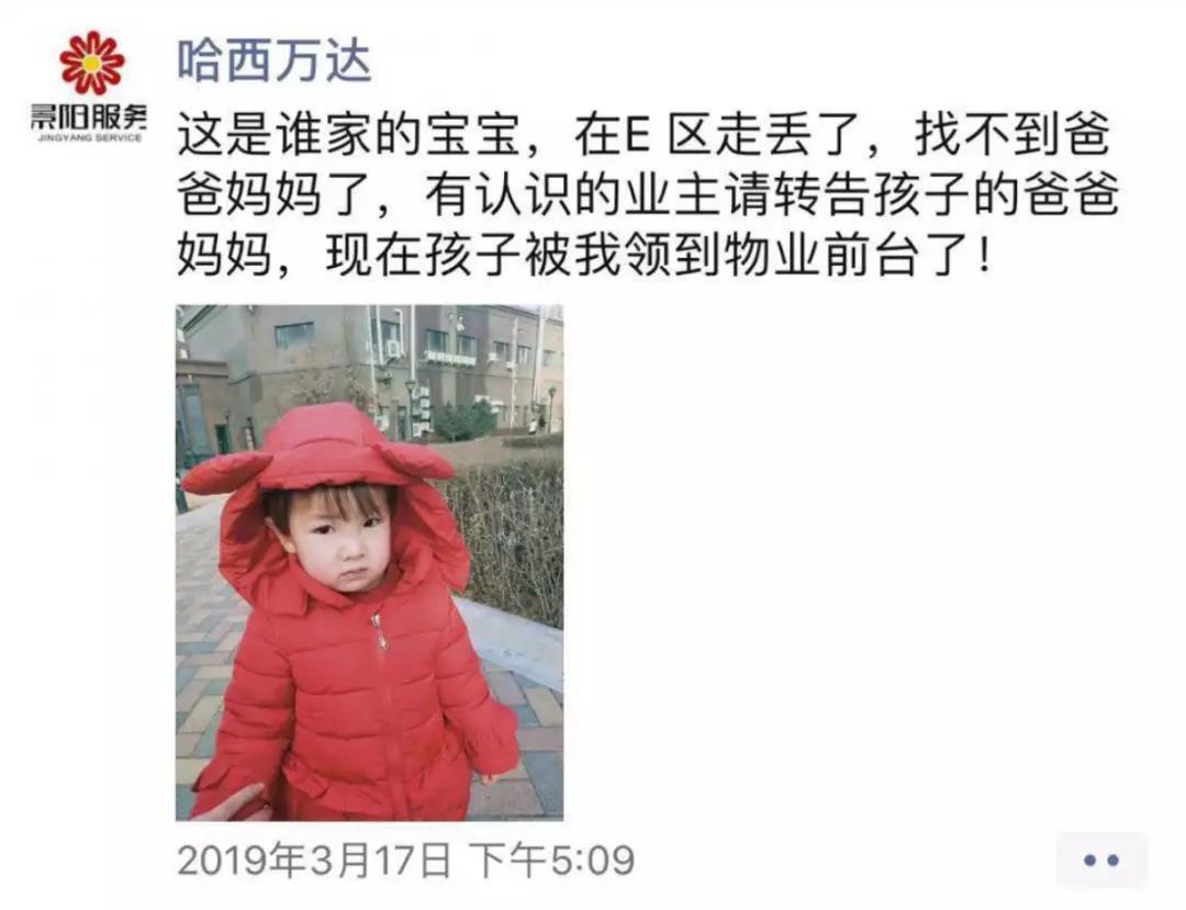 “谁家的宝宝走丢了,她想爸爸妈妈了,有认识的业主请转告家长来物业前台。”——哈西万达专属管家微信朋友圈里发布着。