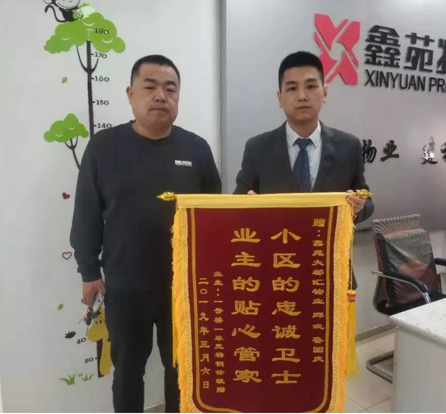 邱武立刻将老人请到东门岗亭,并将自己的外套脱下换给老人披在身上。经过询问老人和查询登记本,确认老人为1号楼的业主家人。因老人年龄大,意识不太清醒,从家里出来迷路了。随即,邱武和杨海林将老人安全背回家。老人的家人得知后,感动的热泪盈眶,鲜红的锦旗上写着“小区的忠诚卫士,业主的贴心管家”,这是对鑫苑物业最中肯的赞誉。