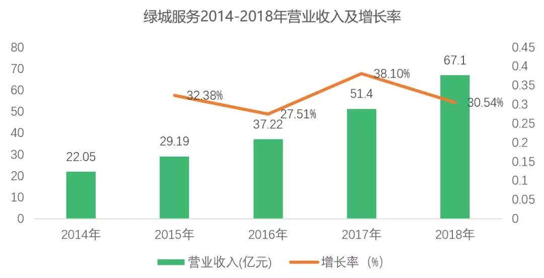 2018年,绿城服务实现营业收入67.1亿元,同比增长30.5%公司2014-2018年其营收的增长水平一直稳定处于30%附近。