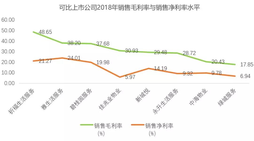 绿城服务的利润率处于可比上市公司中较低水平。2018年公司的销售毛利率为17.85%,销售净利率为6.94%,在已发布年报的上市公司中处于最低水平。