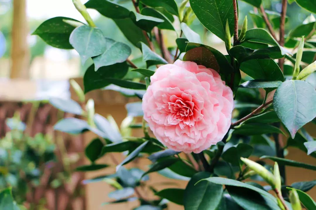 最让陈先生喜爱的倒是一株茶花。花瓣舒展,层次厚实,花型饱满。