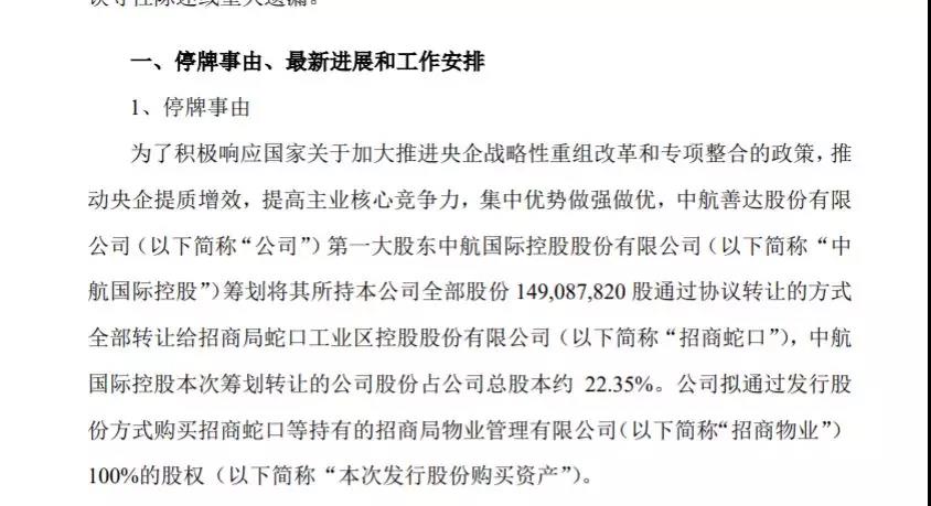 公告显示,公司正在筹划支付现金协议受让中航国际控股股份有限公司持有的中航善达股份有限公司 22.35%股份(149,087,820股),及以持有的招商局物业管理有限公司100%股权认购中航善达非公开发行股份。
