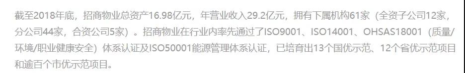 而从营收规模来看,根据招商物业官网披露的数据显示,截至2018年年底,公司总资产16.98亿元,年营业收入达29.2亿元。目前公司在管物业逾500个,服务面积超7500万平米。