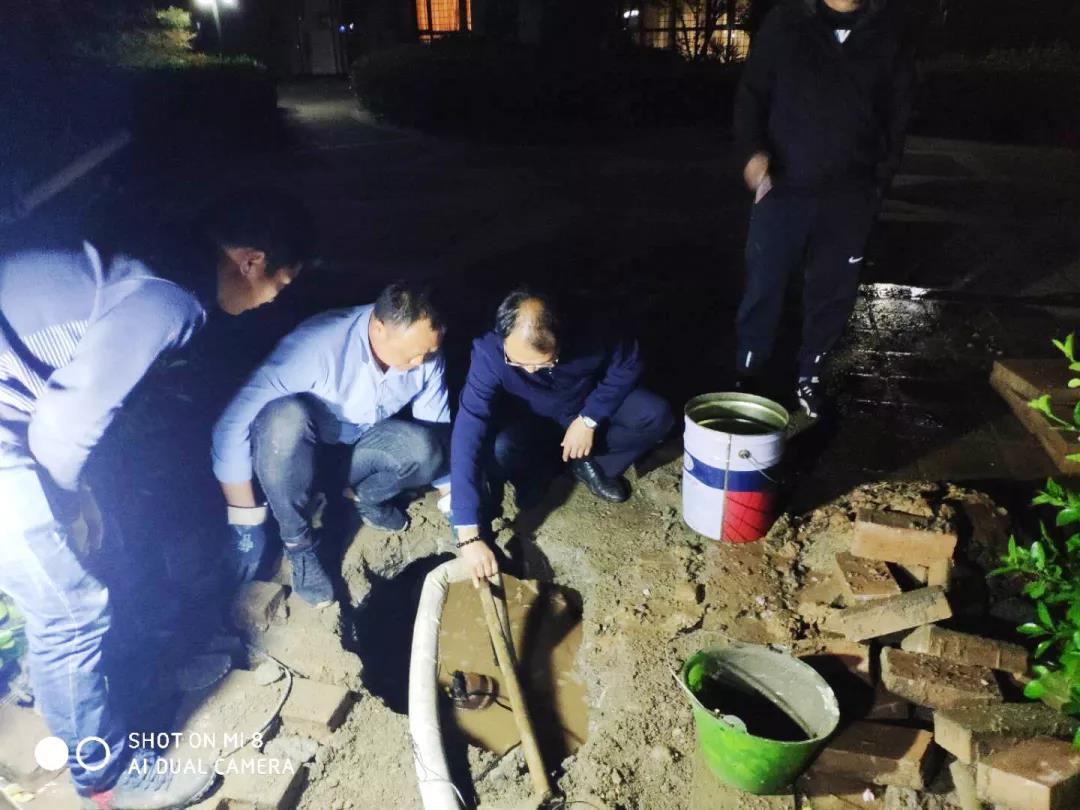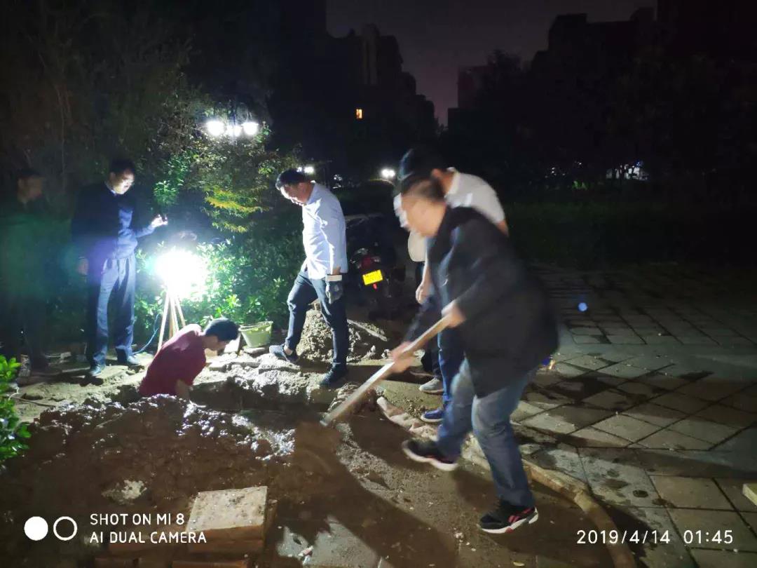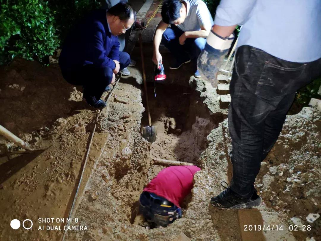 对停水区域各个点的排查工作持续了近13个小时,为了锁定漏水点,在场抢修的物业人员沿着故障主管道一寸寸的排查,挖出了一条深1.5米的排查隧道,直至凌晨4点才终于锁定了漏水点,并采取了紧急处理措施。
