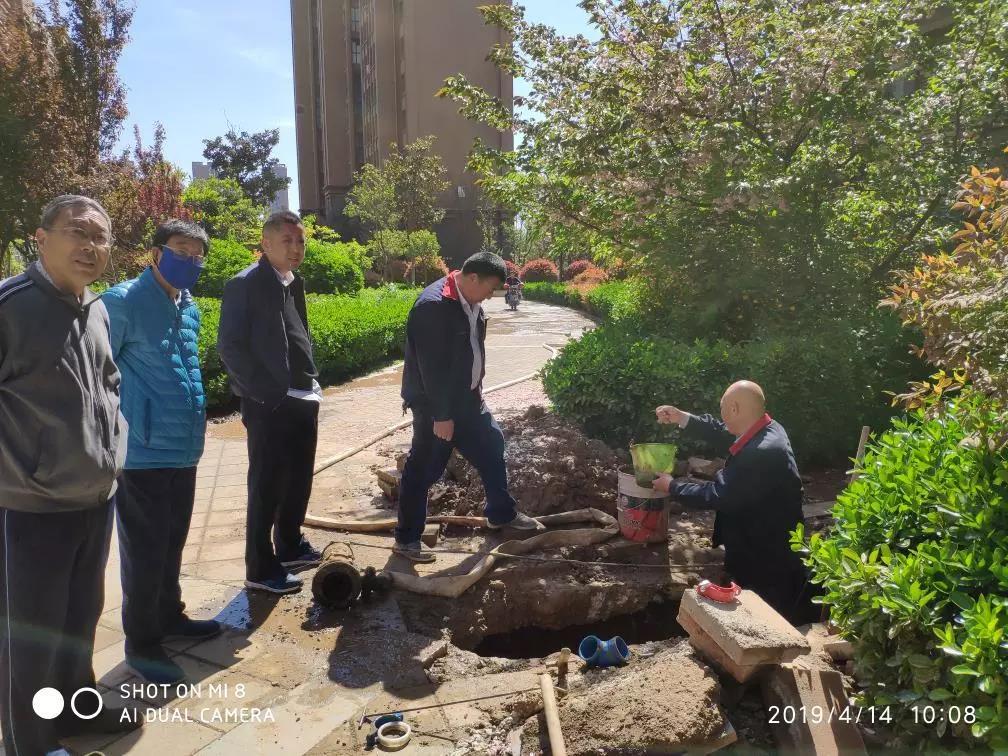 4月13日下午15:00,索克天擎花园项目绿化王师傅发现小区12号楼附近地下主水管爆裂,出现漏水情况,并第一时间联系物业办公室。