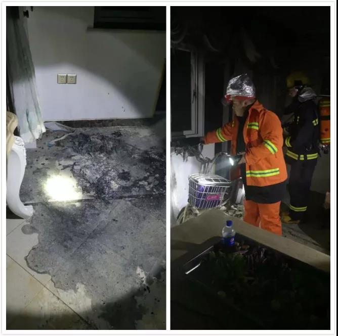 2点32分,通过电话与业确认屋内情况后,安全团队采取破门的方式进入,对现场进行了灭火,火势迅速得到了控制,同时将防毒面具给业主带上后进行转移。三分钟后,消防车赶到现场,消防大队确认起火原因为电动车在客厅充电自燃。事后,万科物业安排人员陪同被困业主送医院检查,身体并无大碍。