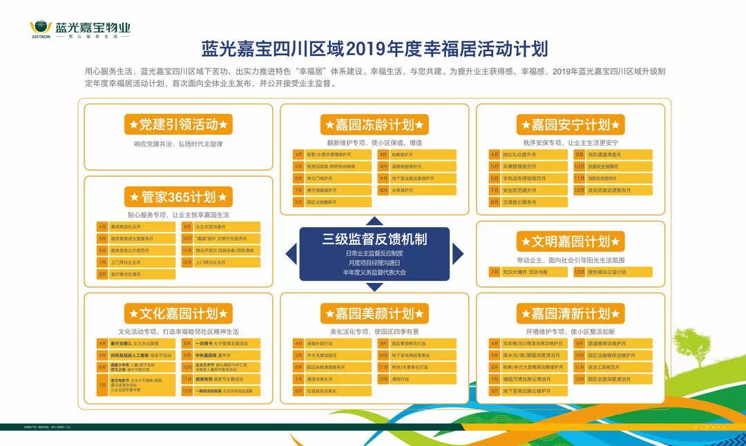 2019年,蓝光嘉宝四川区域在这基础上做了升级,全年制定了“嘉园冻龄计划”、“嘉园安宁计划”、“管家365计划”、“文明嘉园计划”、“文化嘉园计划”、“嘉园美颜计划”、“嘉园清新计划”和“党建引领活动”,并计划以“三级监督反馈机制”保障活动的切实落地与优化。