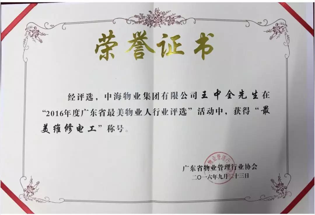 无数的荣誉和奖项就是他“修为”的见证,他曾获得过“全国优秀维修工”、“广东省最美维修电工”、中国物业管理及房地产协会、中海物业各级“优秀员工”或“优秀维修工”称号,对于这些沉甸甸的奖项,他却云淡风轻地说道:“荣誉只是对过去的肯定,工作还是要继续做好。”
