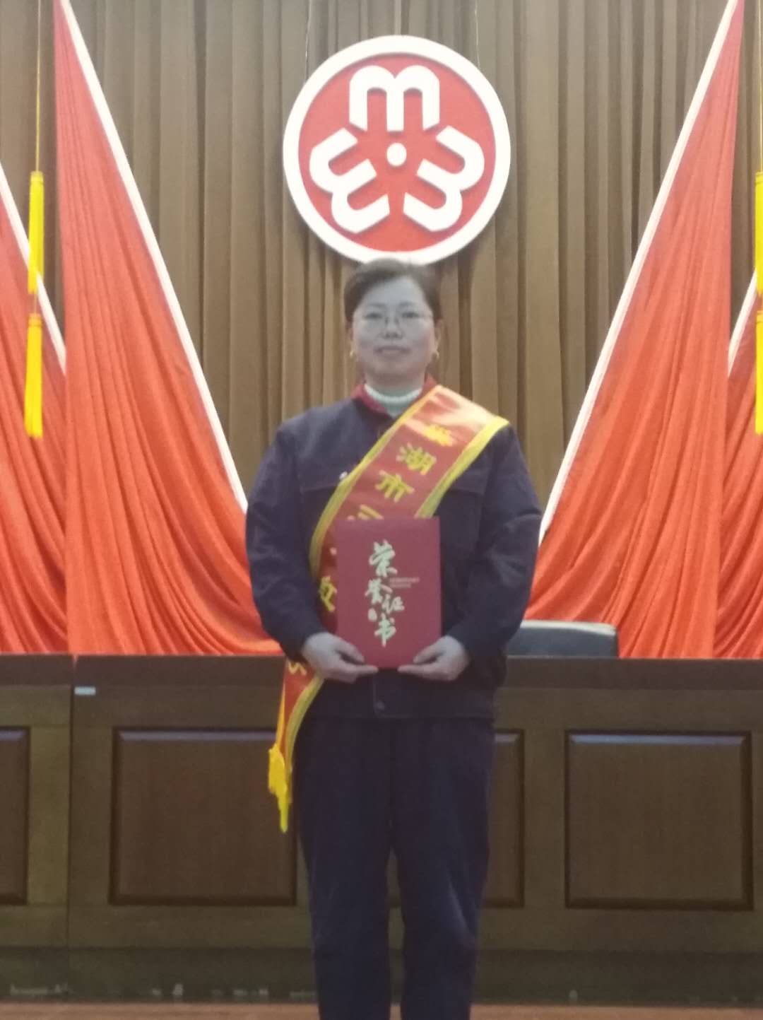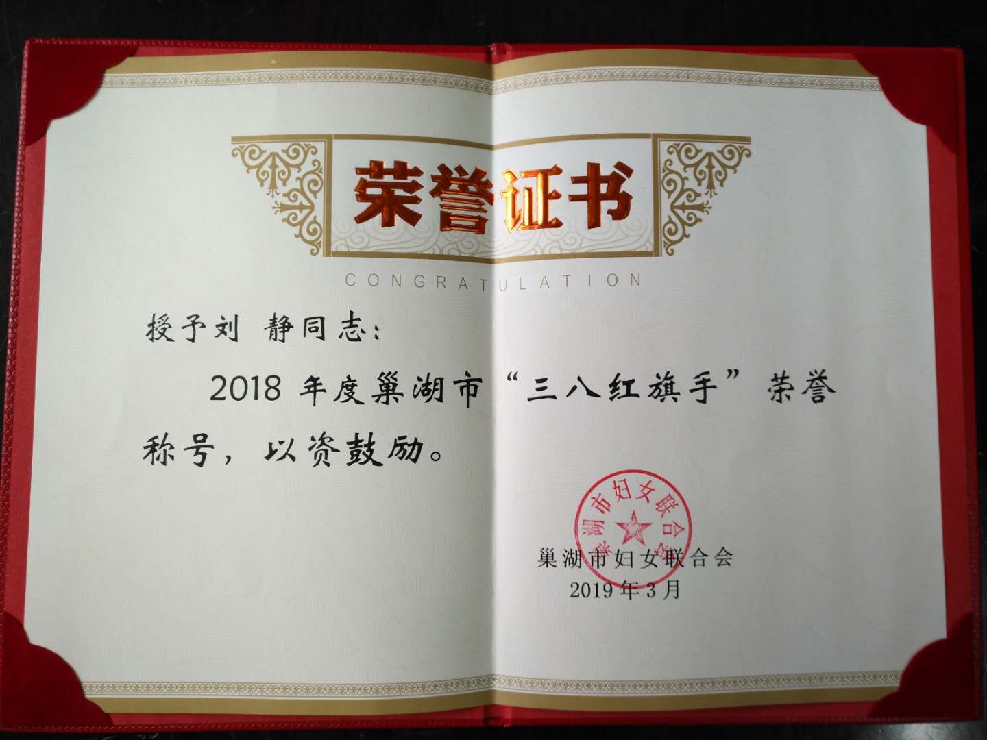 刘静,合肥市房地产经营公司一名普通的物业管理一线劳动者,在平凡的卫生保洁岗位上,十年如一日,用一把扫帚、一块抹布、一柄尘推,展现物业人在奋斗的最美“姿态”。2019年 “五一”国际劳动节来临之际,为表彰她的先进事迹,安徽省巢湖市妇女联合会授予她巢湖市三八红旗手荣誉称号。