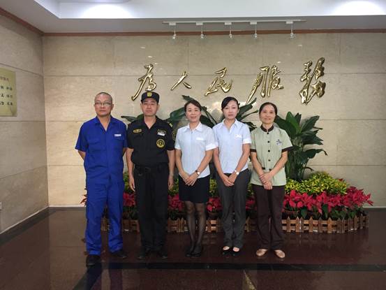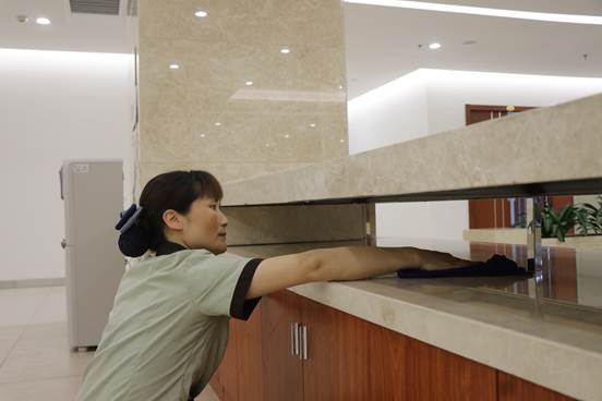 2018年5月份,项目物业服务中心收到了国地税合并文件,项目立即启动二次装修预案,合并期间大楼里随处可见各式各样、大小不一的装修垃圾,粉刷时掉落下的白色涂料粉被风一吹,散落得到处都是,地面上全是污迹。这时候日常保洁已十分不易了,工作强度和压力都很大,但许美娇总是微笑面对。任务最多的时候,常常要忙到夜里十一二点,第二天清晨六点又要准时到岗工作。劳累让团队成员怨声载道,抱怨不断,为了稳定团队,许美娇在做好安抚工作之余,更是身先士卒-----不偷懒、不懈怠、不退缩,长时间奔忙在服务一线,一天下来连水都没能喝上几口。她这种认真负责的工作态度深深的感染了同组的成员们,让她们更努力、更用心的投入到保洁工作中去。2018年7月1日国地税正式合并,项目物业服务中心团队人员圆满完成了此次重大任务,并获得由福州市地方税务局机关服务中心赠送锦旗,表示感谢和认可。