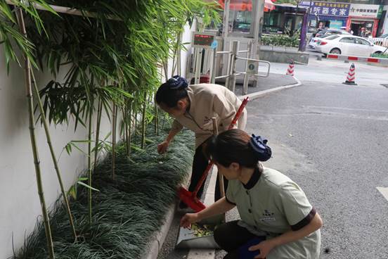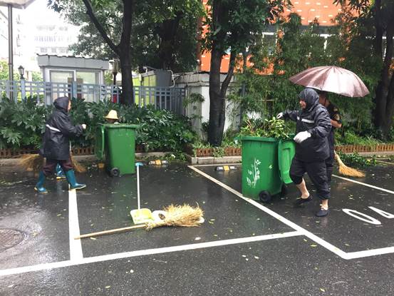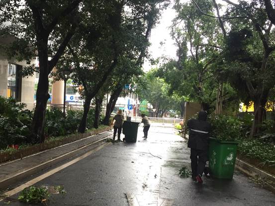 与台风相伴的沿海城市,每年都是迎接几个超强台风,台风过境后的大楼外围环境更是一片狼藉,路面上到处散落着树叶、果实和各类垃圾,绿化带内部分植株倒了七八,还有些被吹到了路面上,卫生清理工作十分严峻。许美娇她总是冲在第一线,带领团队及时清理。有一次清理过程中还不小心让玻璃渣子划出一道大血口子,大家劝她休息,她反而还鼓励大家,“都是小伤不碍事,我们加加油,手脚麻利点,业主来上班就少受点罪。