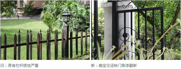 “斑点”修复。公区围栏刷漆翻新、信报箱翻新,减缓老化,一点一滴地修复面容上的“斑点”、污渍。