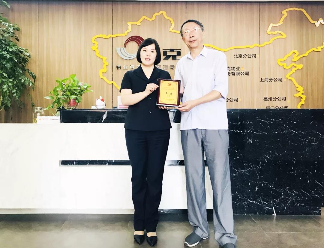 5月15日,经八路街道”两新”党工委书记潘力同志,省委社区党总支书记秦志军同志亲自来到索克物业总部对索克党委进行了表彰,并将荣誉奖牌授予索克党委书记郭芳同志。