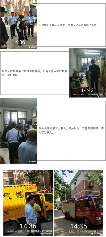 21日下午2:30左右,国控物业公司华药项目部副经理张晓磊、张秀生等人接到电话后,立即放下手中工作赶到现场。当事人的父亲一见到物业工作人员,当即跪了下来恳求予以解决。张晓磊等人赶紧扶起老人,与派出所民警一起紧急现场疏散整栋楼人员。随即上楼赶到当事人家中。当事人家中防盗门紧锁,经过其家人和物业工作人员的努力劝说,当事人打开了房门,一见有外人进来,他立即拿起菜刀挥舞着,要求所有人离开他家。业主家中一片狼藉,镜子等各种物品碎了一地。物业公司工作人员张秀生躲在其家人背后,瞅准当事人家人与其谈话的时机,他一个箭步冲上去,一把抓住菜刀,紧接着一个背摔,把当事人按倒在地,派出所民警和110民警上前控制住了当事人。几分钟后,特警赶来带走了当事人,华药项目部工作人员安慰了当事人的家人后,方才离开现场。
