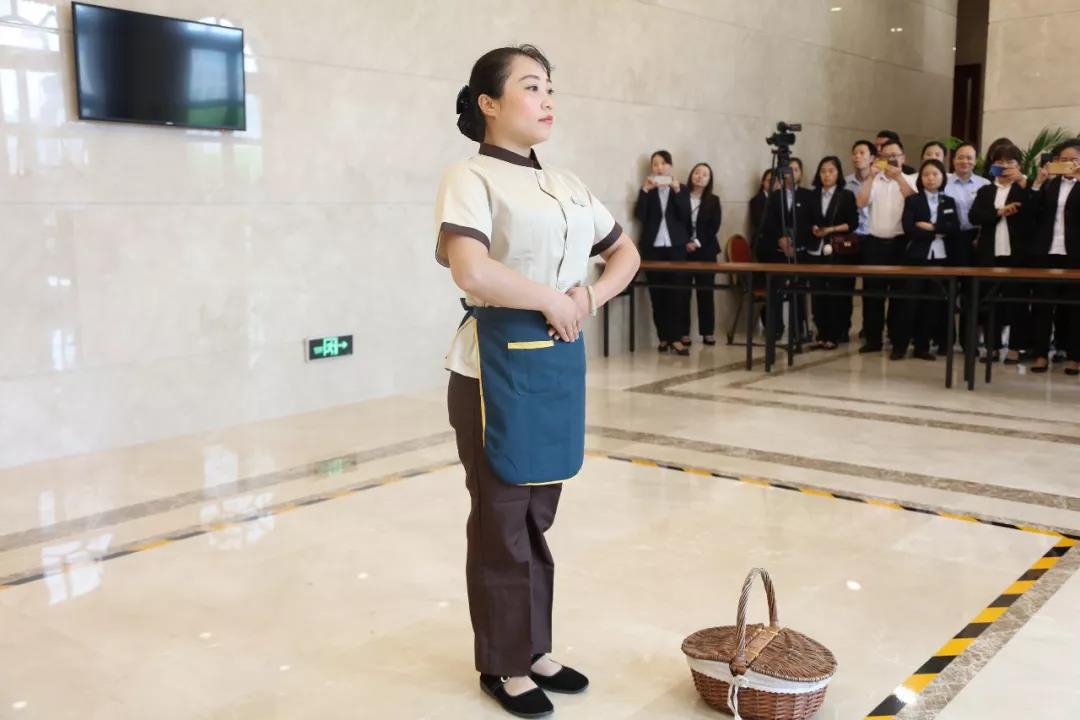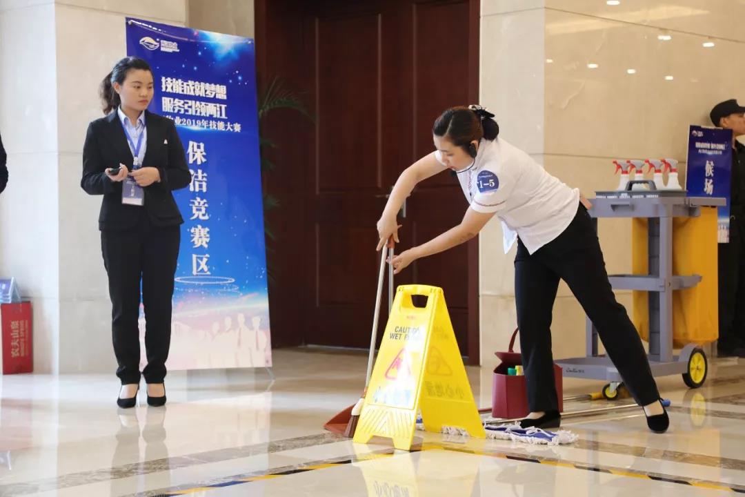 岗位实操环节中,按照抽取的题目,保洁人员清擦玻璃、地面胶痕、使用地面尘推,她们熟练的作业流程及正确的操作步骤,无不展现出保洁人员的专业、认真、规范以及工作标准。
