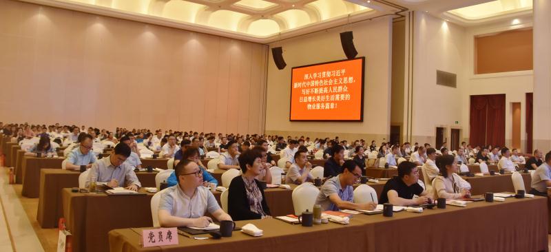会场一侧标语“深入学习贯彻习近平新时代中国特色社会主义思想,写好不断提高人民群众日益增长美好生活需要的物业服务篇章”格外引入注目。