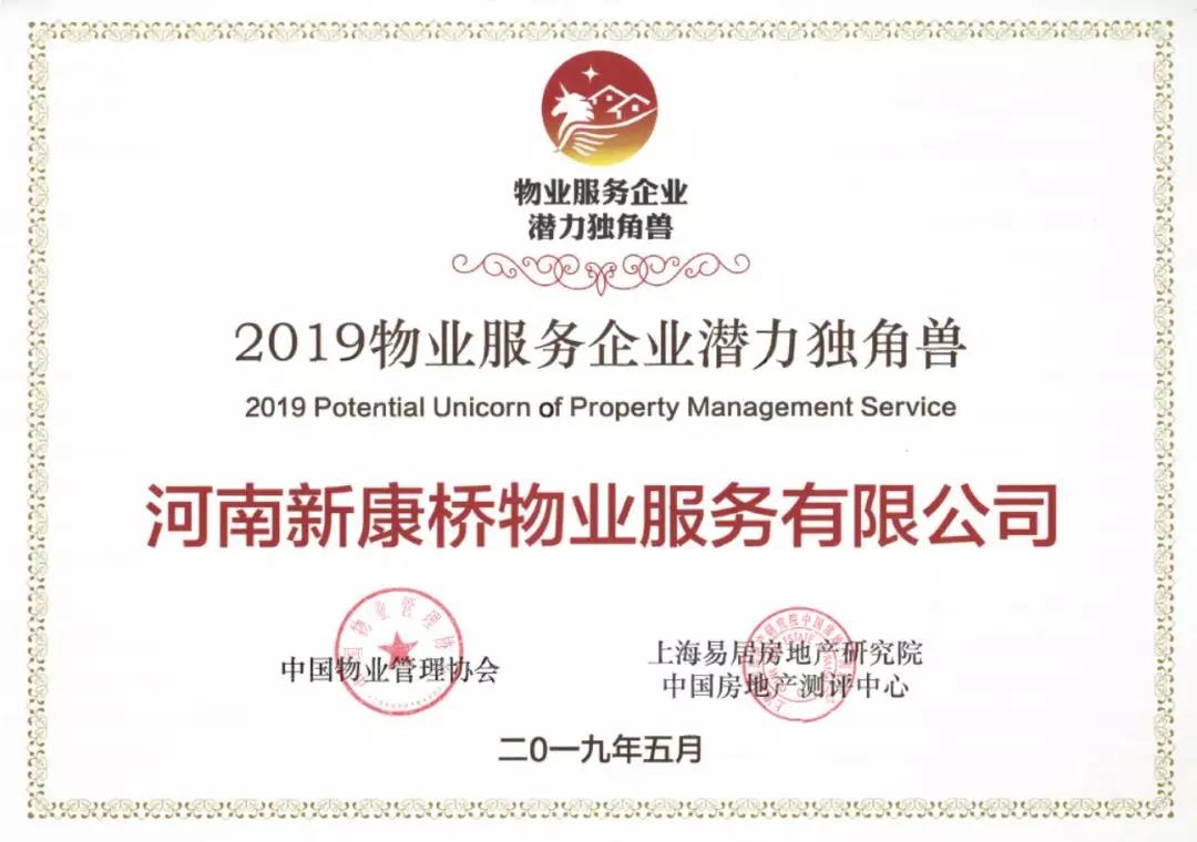 河南新康桥物业服务有限公司荣获“2019物业服务企业潜力独角兽