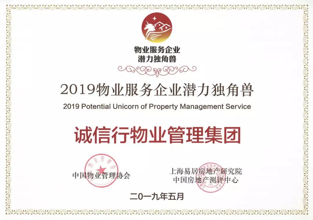 诚信行物业管理集团荣获“2019物业服务企业潜力独角兽