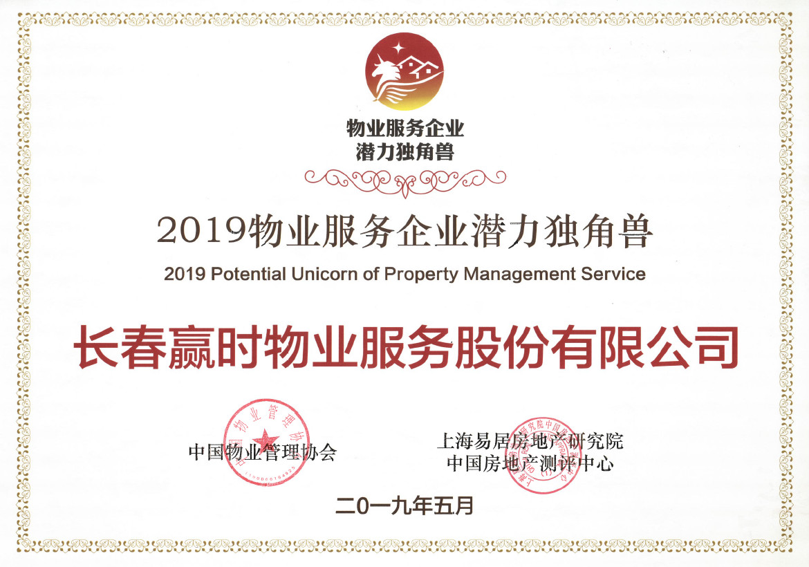 长春赢时物业服务股份有限公司荣获“2019物业服务企业潜力独角兽”。